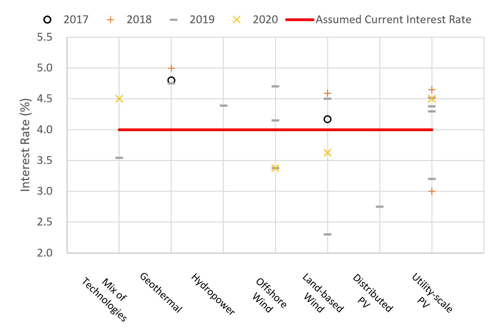 The following figure shows collected data on the cost of debt for renewable energy assets. Publicly available data points represent a mix of renewable energy technologies, project and portfolio financing's, timing and loan tenors (i.e., length) and actual versus modeled rates. Though "like-to-like" data comparisons are ideal, the data are limited and the data collected show a fairly consistent and fairly narrow spread between technologies. For ATB modeling purposes, we assume a 4.0% term interest rate (inclusive of fees and reserves) for all renewable energy technologies, reflecting the mix of data types and level of precision of in data.