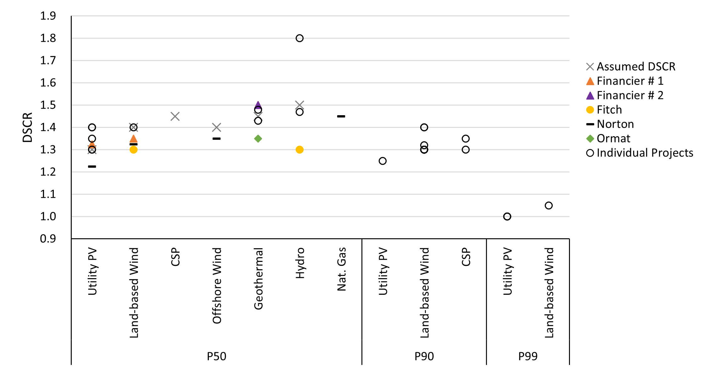 The following figure shows collected data on the DSCRs for renewable energy assets and the assumed DSCR for the 2023 ATB analysis. P50 represents an average-level of energy production (or 50% likelihood to generate that much or more electricity), and P99 represents a production level that the project has a 99% chance of exceeding. The assumed P50 DSCR, per technology, is based on collected data of P50 DSCR and is influenced by the difference in average DSCRs between technologies in P90 and P99 scenarios, as well as collected DSCRs from ratings agencies for stress modeling cases (not shown).