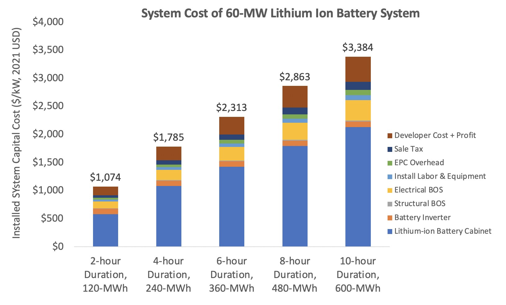 $$ \text{Total System Cost (\$/kW)} = \text{Battery Pack Cost (\$/kWh)} \times \text{Storage Duration (hr)} + \text{BOS Cost (\$/kW)} $$
