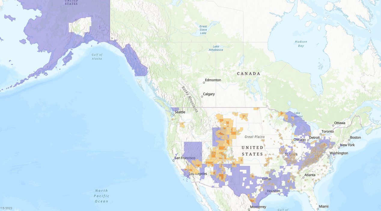 The following map shows a census tract directly adjoining a census tract with a coal closure (light orange), a census tract with a coal closure (dark orange), and in dark purple the areas metropolitan statistical areas (MSAs)/non-MSAs that meet both the Fossil Fuel Employment (FFE) threshold and the unemployment rate requirement (IRS, 2023).